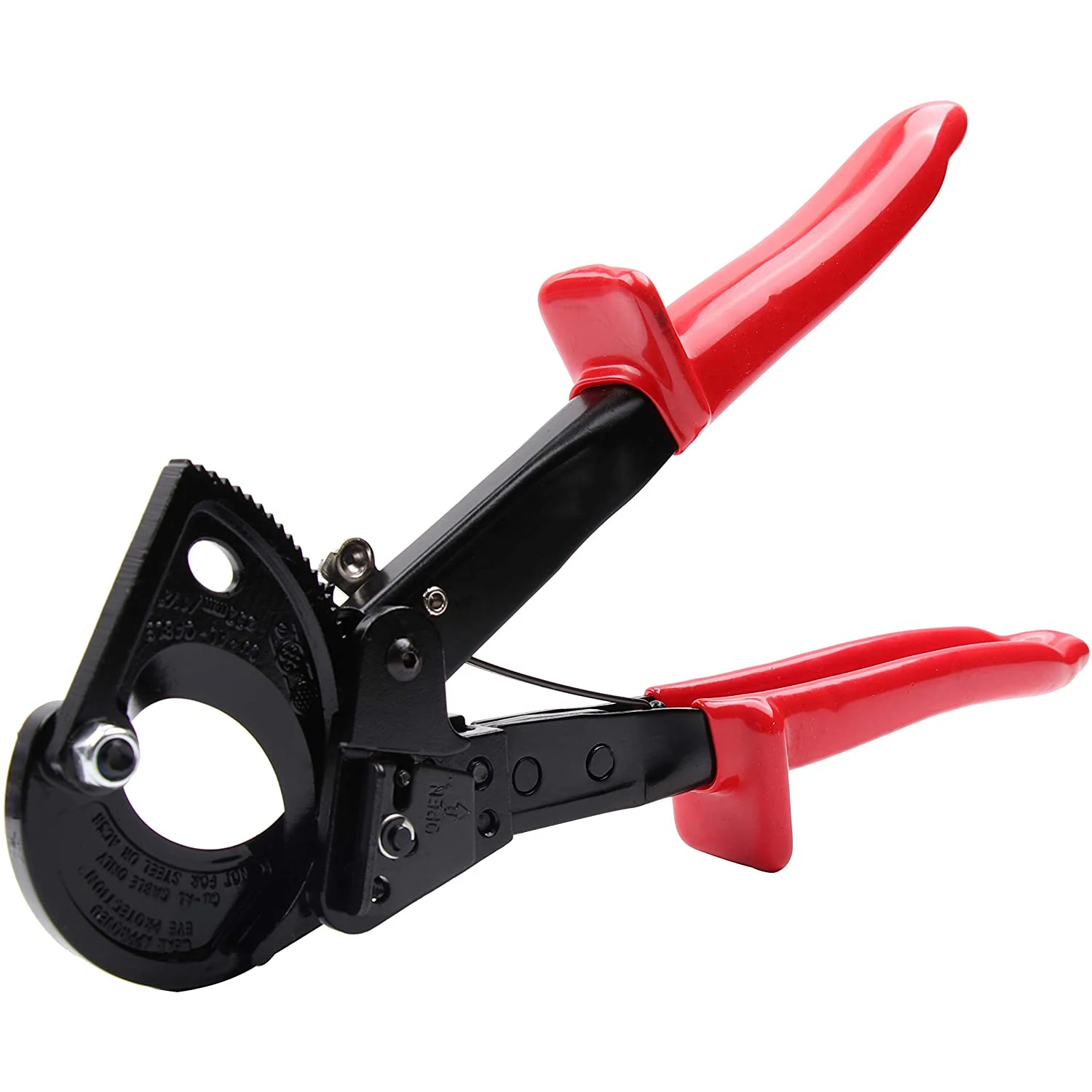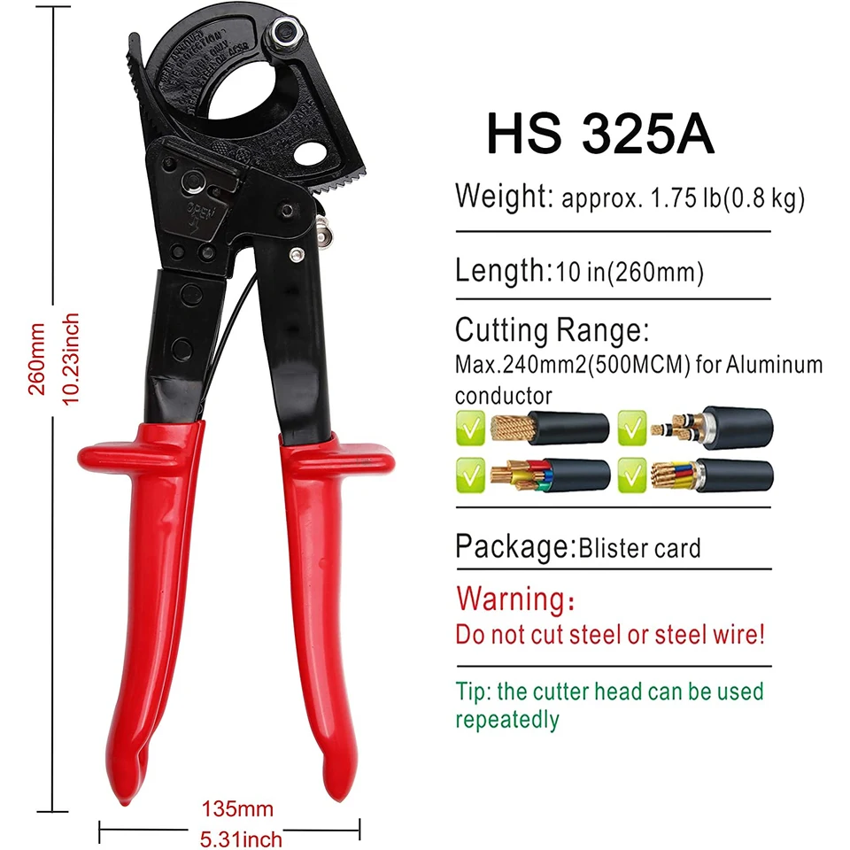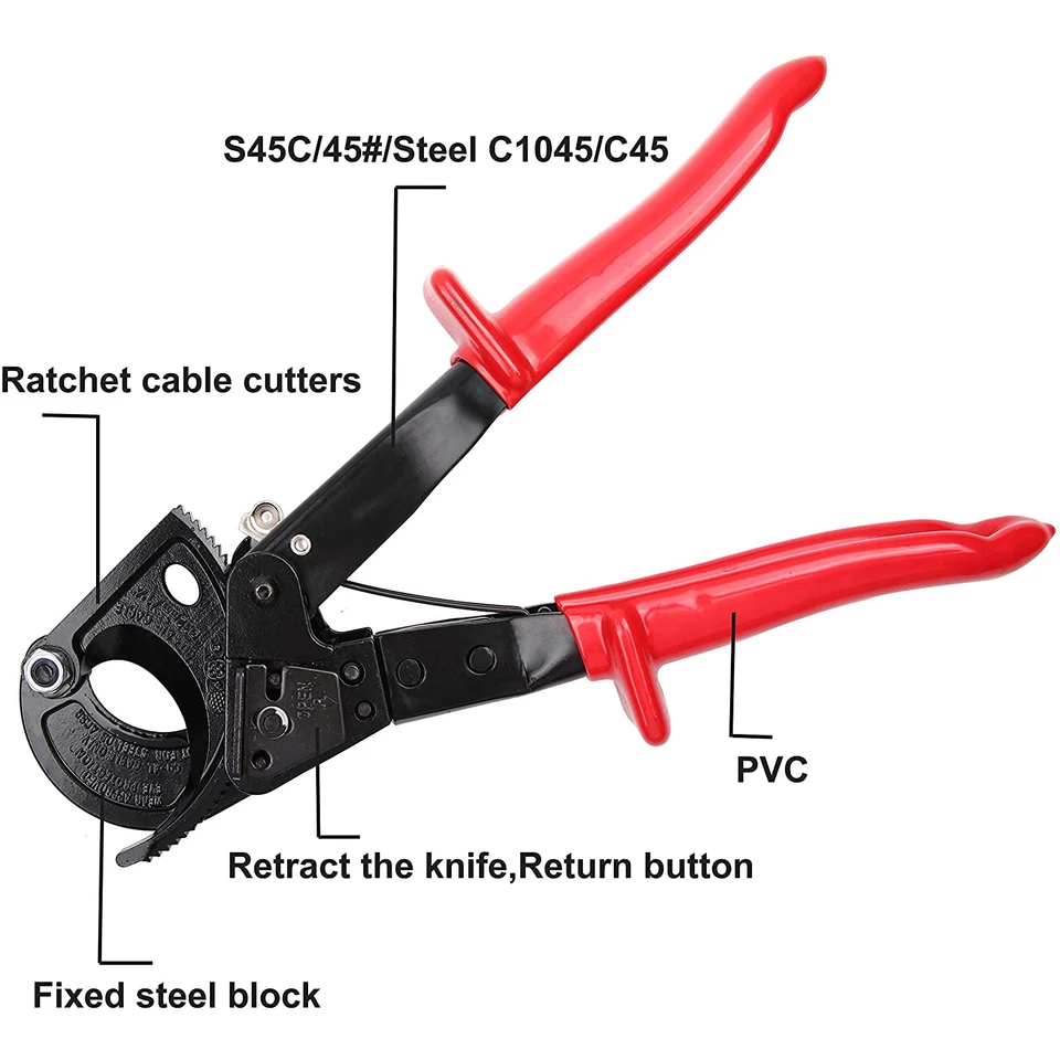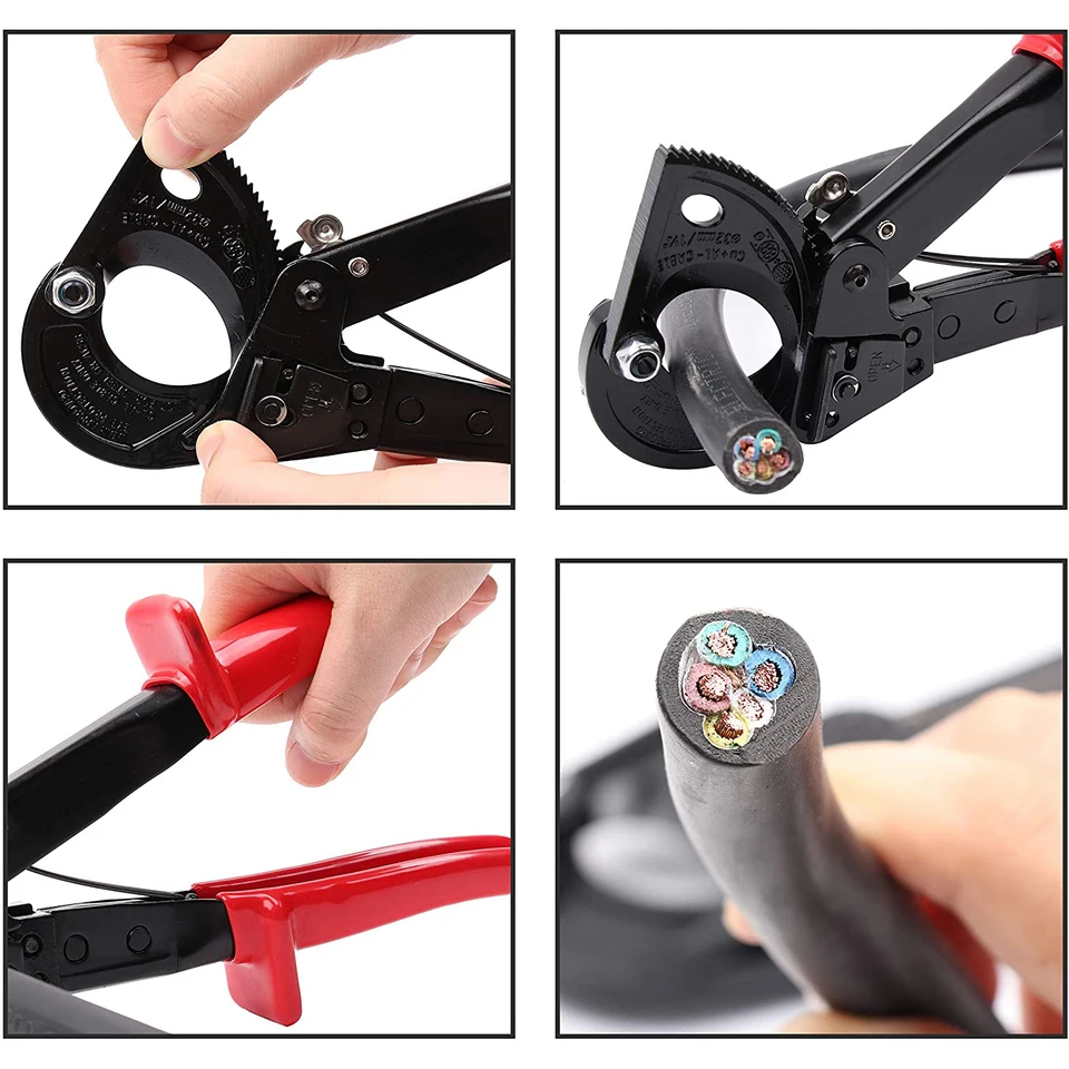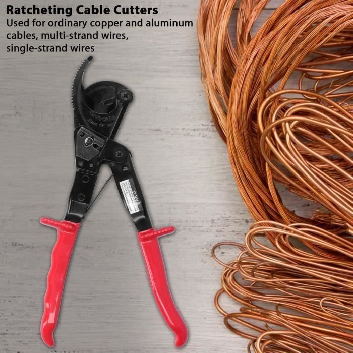 Lignes de pression des deux côtés de la poignée pour une utilisation facile., <br> Il nous fait plaisir de vous servir, ne doutez pas de votre importance pour nous. Ciseaux à Câble à Cliquet EJ.life - Coupe-câble En Acier à Haute Teneur Spécifications : Type d'article : Coupe-câble Matériau :Acier à haute teneur en carbone Capacité de coupe :240 mm² maximum Application :Câble en cuivre et aluminium/fil solide/fil toronné Type : Cliquet/Retour élastique automatique Couleur : Surface noire et poignée rouge Liste de colisage Le tranchant de la lame est traité par plusieurs processus, il est durable et ne rouille pas facilement., <br> La conception de structure à cliquet qui économise le travail réduit la fatigue lors du sertissage à long terme., <br> TECHNOLOGIE AVANCÉE: La dernière trempe haute fréquence assure la dureté et la durée de vie des dénudeurs de câbles., Caractéristique Fonctionnalité: 2., La conception de la structure à cliquet à économie de main-d'œuvre réduit la fatigue lors du sertissage à long terme., 3., Poignée antidérapante, économie de travail et, confortable à tenir et conforme à la conception ergonomique., 4., Conduites de pression des deux côtés de la poignée pour une utilisation facile., 5., Équipé d'un verrou de sécurité pour une utilisation pratique et facile. Le coupe-câble à cliquet VEVOR offre une coupe puissante avec des lames en acier au silicium-manganèse, une utilisation sans effort d'une seule main et une conception compacte pour les espaces restreints. L'engrenage de propulsion du produit est spécialement traité thermiquement, il est solide et résistant à l'usure, capable de supporter des travaux de haute résistance à long terme. Coupe-câbles À cliquet | 95 36 250 CONCEPTION ERGONOMIQUE: Poignée antidérapante, économie de travail et, confortable à tenir et conforme à la conception ergonomique. Boulons, vis haute fiabilité à haute dureté, procession précise en...